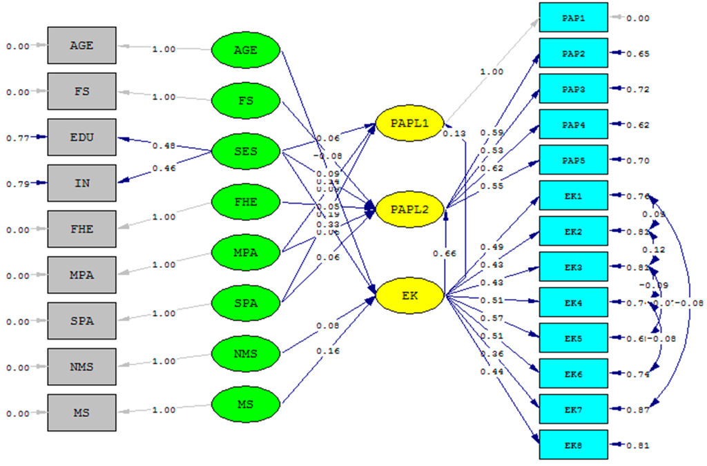 | Environmental knowledge(EK) | 0.13 *** | 0.66 *** | 0.50 *** | ||