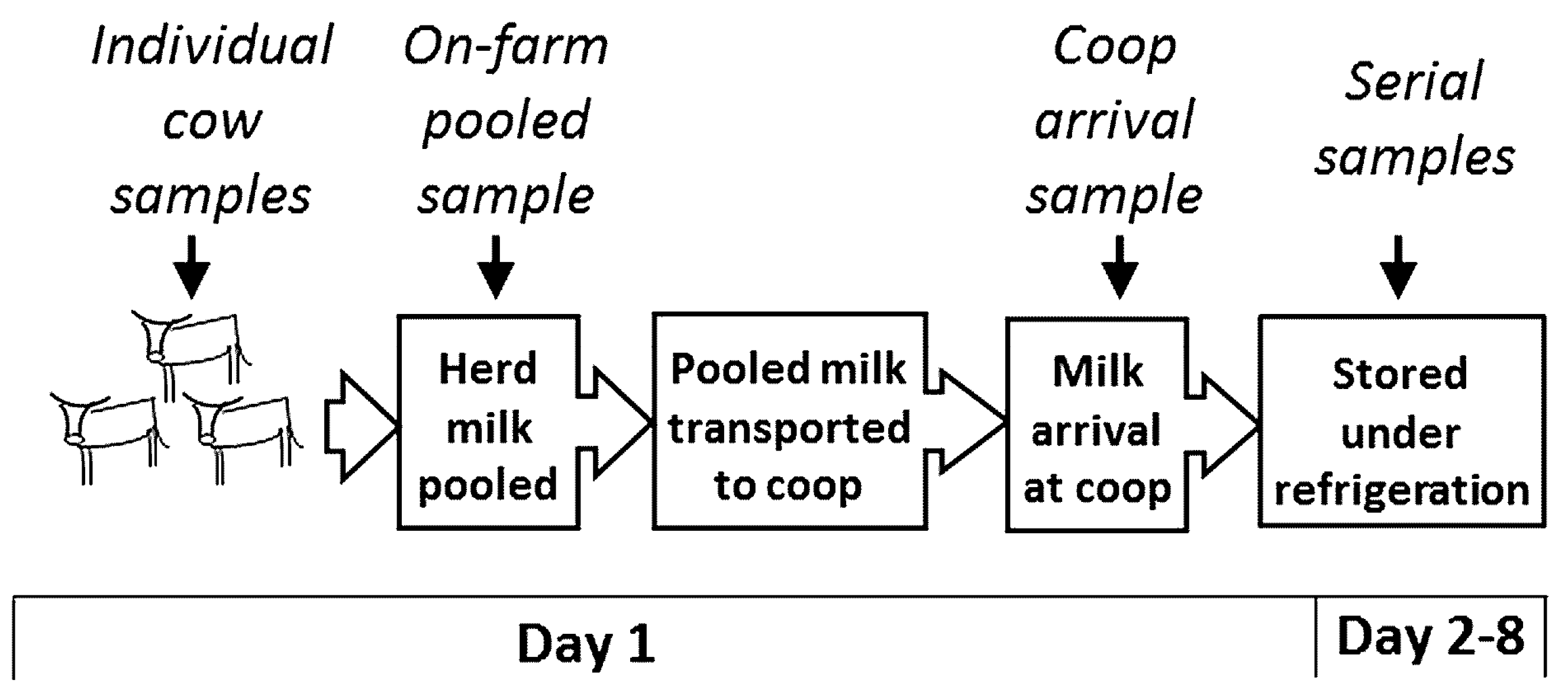 Dairy cooperative: After milking, the herd milk was transported to the dairy cooperative and another sample was taken (5 mL). Transportation details were recorded (time, environmental air temperature and mode of travel).