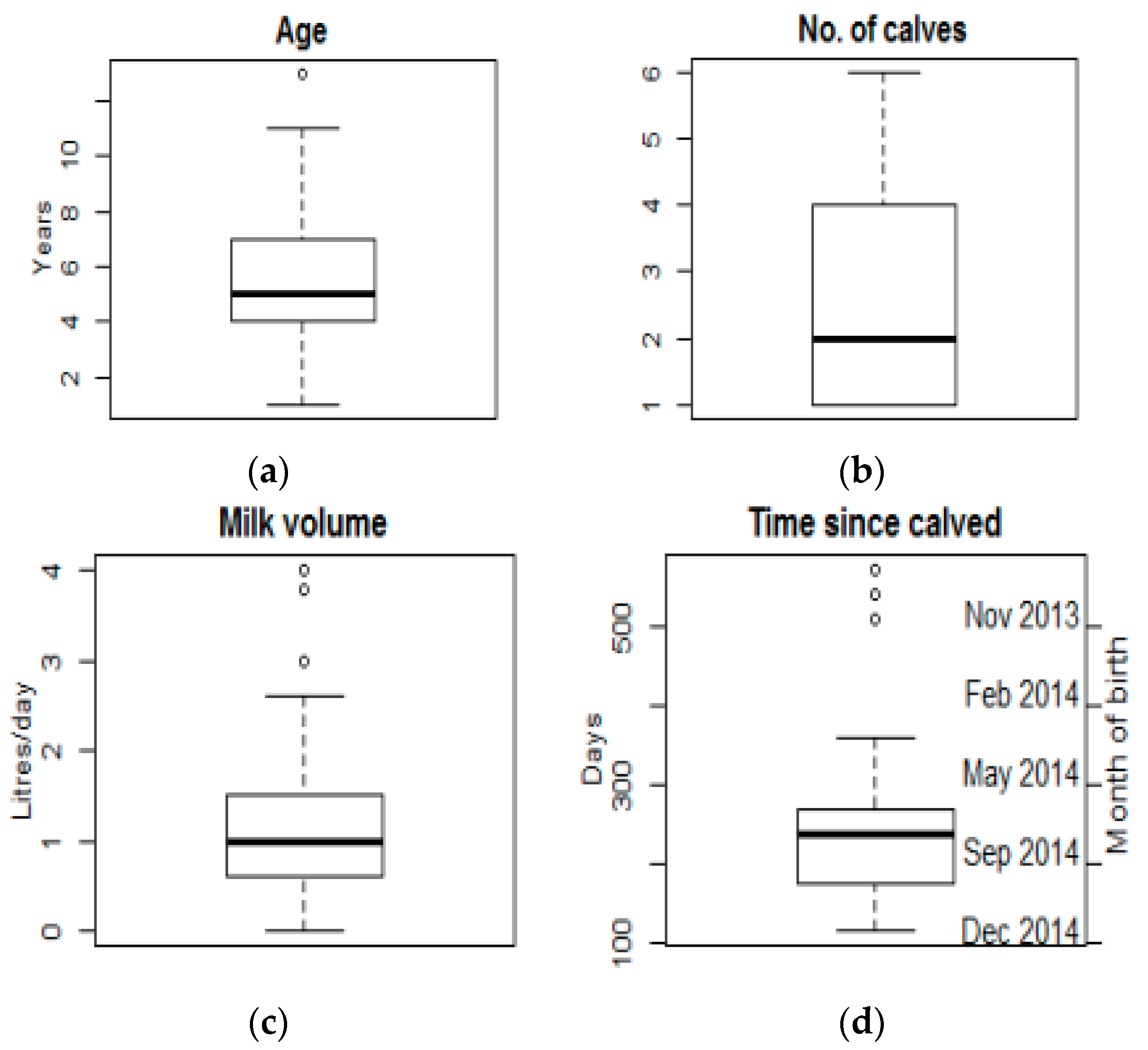 Characteristics of milking cows sampled (n = 86), including cow age (a); number of calves that cows had had in their lifetime (b); volume of milk collected from a cow on day of investigation (additional milk would have been drunk by calves directly from cows) (c); and number of days since a cow had last calved and month of last calving (d).