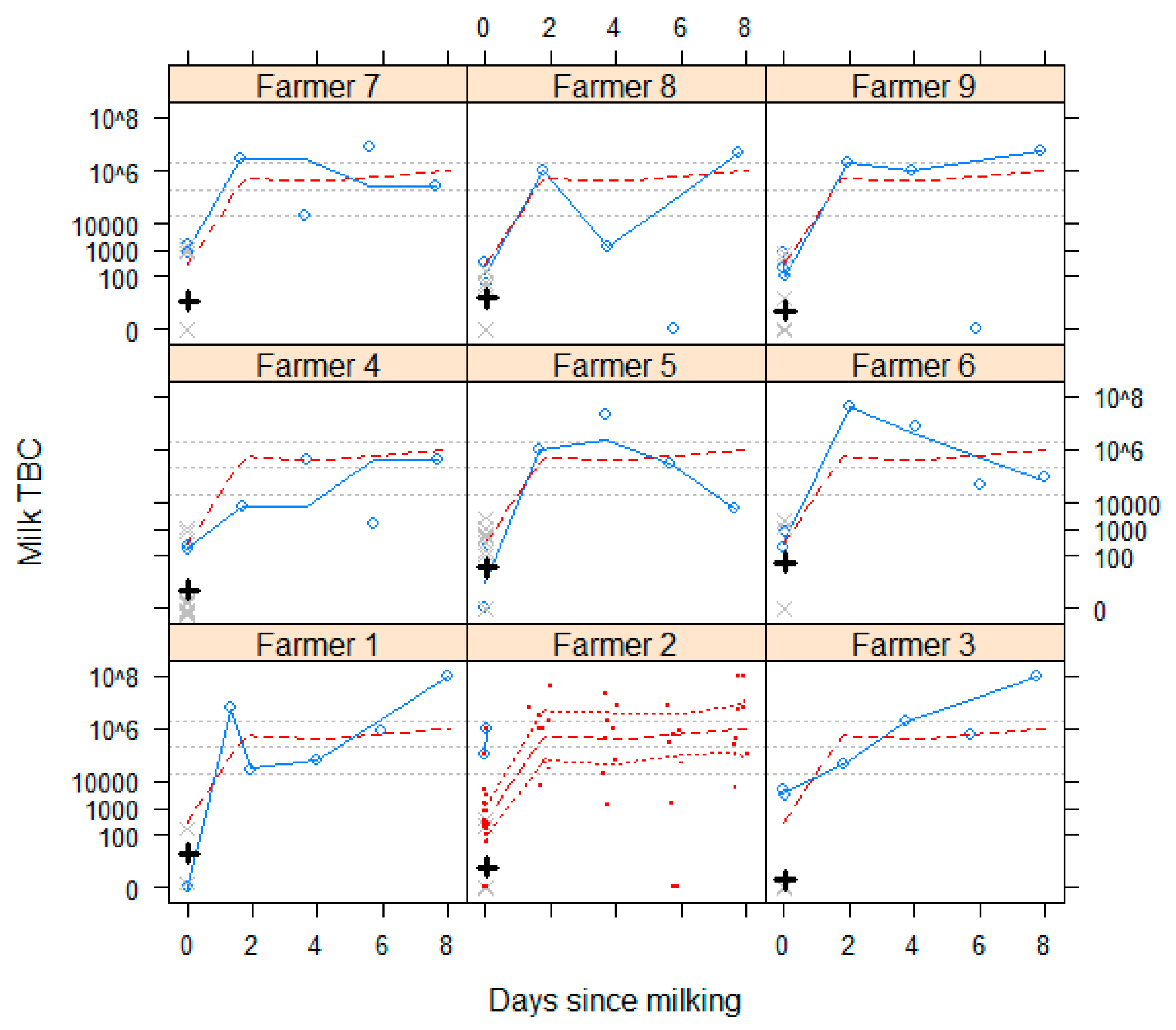 Blue circles show total bacterial counts (TBC) for pooled milk samples from each farm, taken on-farm immediately after milking and on arrival at the dairy cooperative (both days since milking = 0), followed by samples of refrigerated milk taken for up to eight days after milking. These points are joined by a blue Lowess smoothed line. Individual cow samples at milking (day 0) are shown using grey crosses with their geometric mean in black. Serial samples were not collected after arrival at the cooperative for farmer 2. A Lowess smoothed average TBC for all pooled samples from all farms is shown on all panels as a red dashed line, with upper and lower 95% confidence intervals for this Lowess all-farms’ average TBC shown on the panel for farmer 2, all TBCs for all farmers are also shown on this panel as red dots. TBC thresholds indicated by grey dotted lines show 20,000 cells/mL = EU legal limit for raw milk sold for consumption; 200,000 cells/mL = Zambia grade B upper limit and COMESA grade A upper limit; and 2,000,000 cells/mL = upper COMESA limit for milk to be processed. COMESA = Common Market for Eastern and Southern Africa.