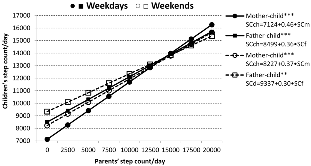 - Sigmundová, D.; Sigmund, E.; Vokáčová, J.; Kopčáková, J. Parent-child associations in pedometer-determined physical activity and sedentary behavior on weekdays and weekends in random samples of families in the Czech Republic. Int. J. Environ. Res. Public Health 2014, 11, 7163–7181. [Google Scholar] [CrossRef] [PubMed]