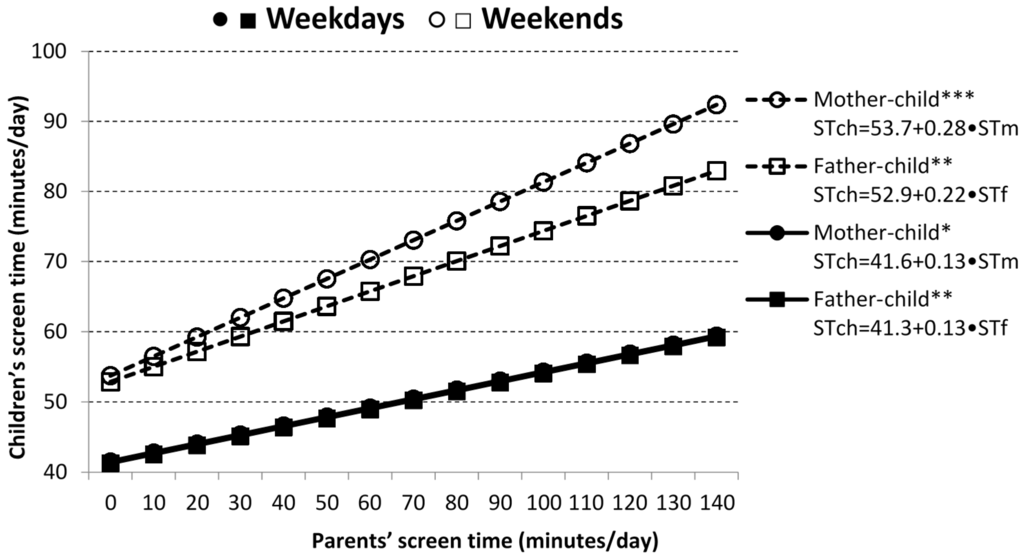 - Jago, R.; Thompson, J.; Sebire, S.; Wood, L.; Pool, L.; Zahra, J.; Lawlor, D. Cross-sectional associations between the screen-time of parents and young children: Differences by parent and child gender and day of the week. Int. J. Behav. Nutr. Phys. Act. 2014, 11, 54. [Google Scholar] [CrossRef] [PubMed]