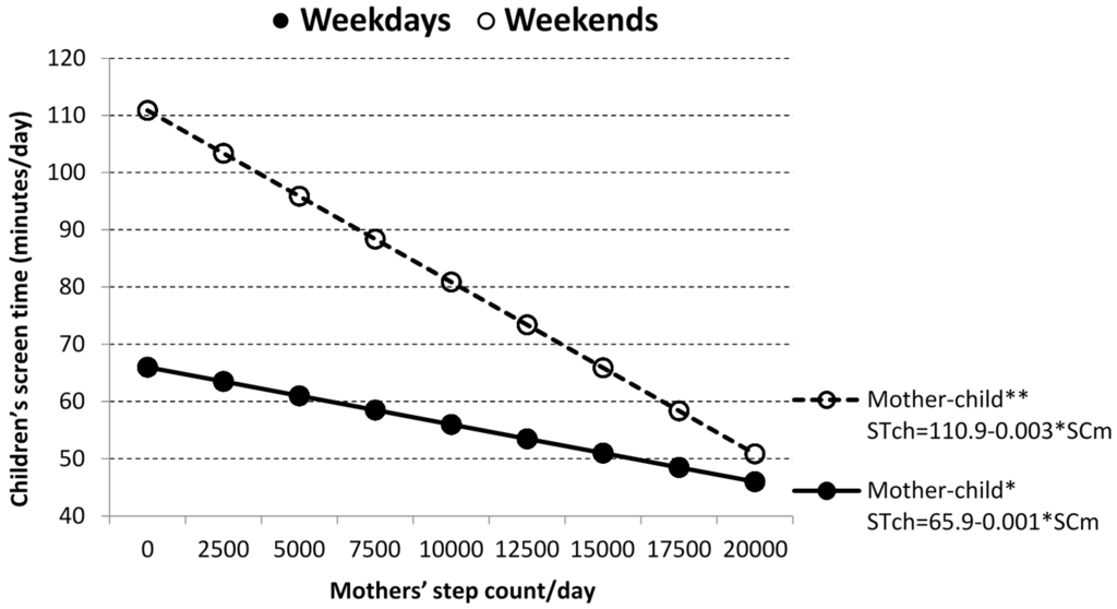 3.3. Quantification of the Association between Parents’ and Children’s Step Counts and Screen Time