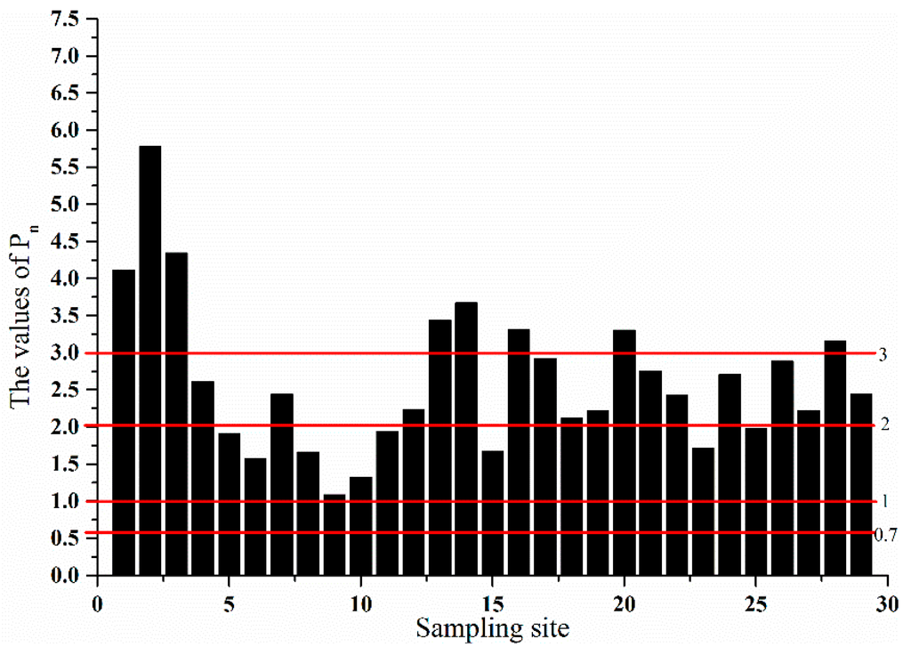 To evaluate integrated contamination characteristics of all the heavy metals in bed sediment, Nemerow integrated pollution (Pn) index was applied. Pn was expressed as Equation (3), and the Pn levels are illustrated as Table 1 [22].