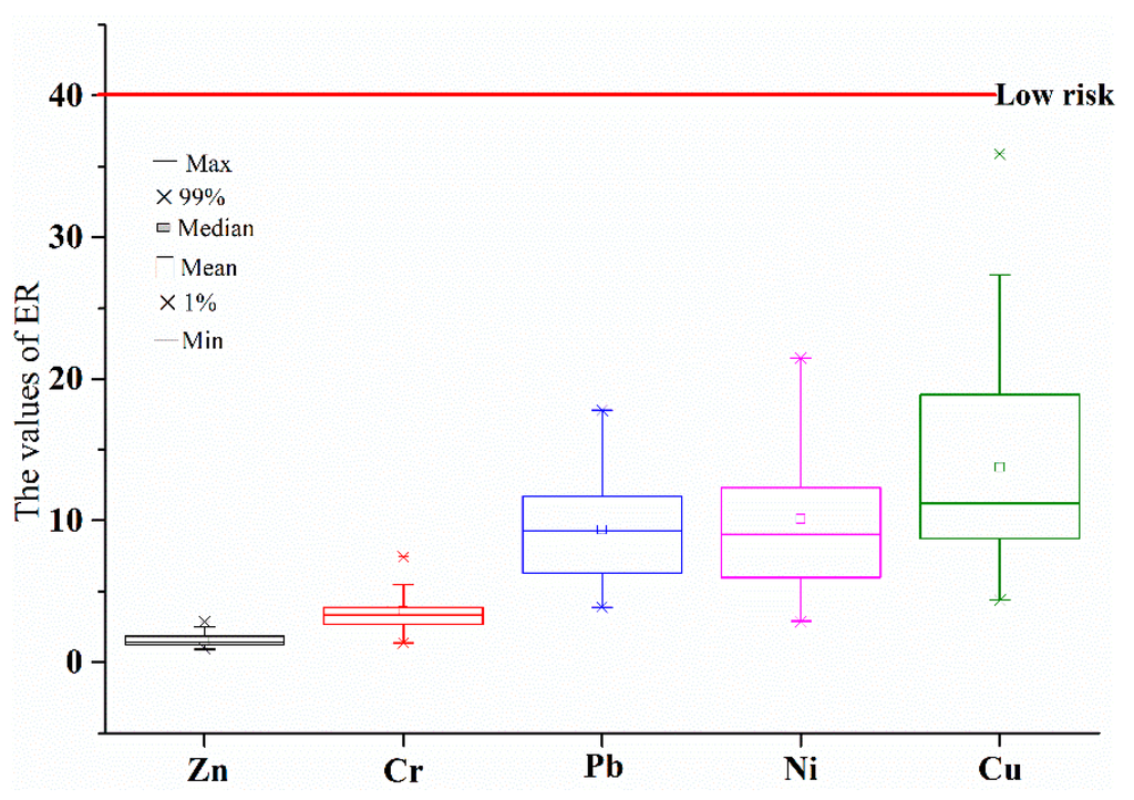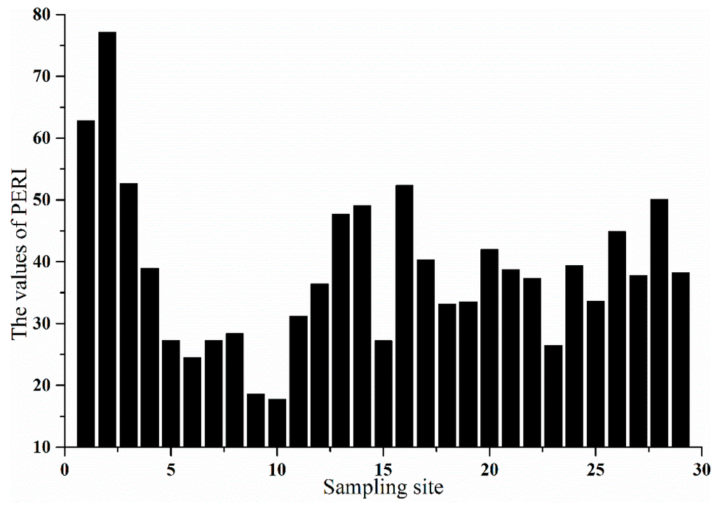 In this work, PERI was used to assess ecological risks of all the heavy metals and single heavy metals in different sampling sites. As represented in Figure 3, the values of ER for five heavy metals in all the sampling sites were smaller than 40.