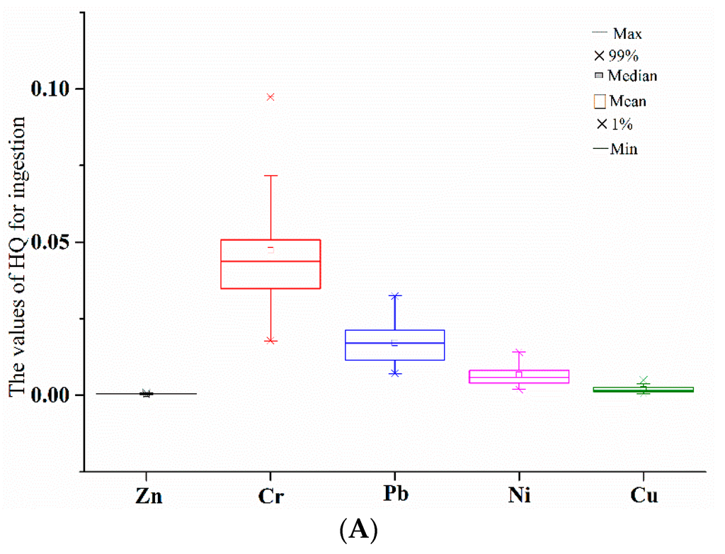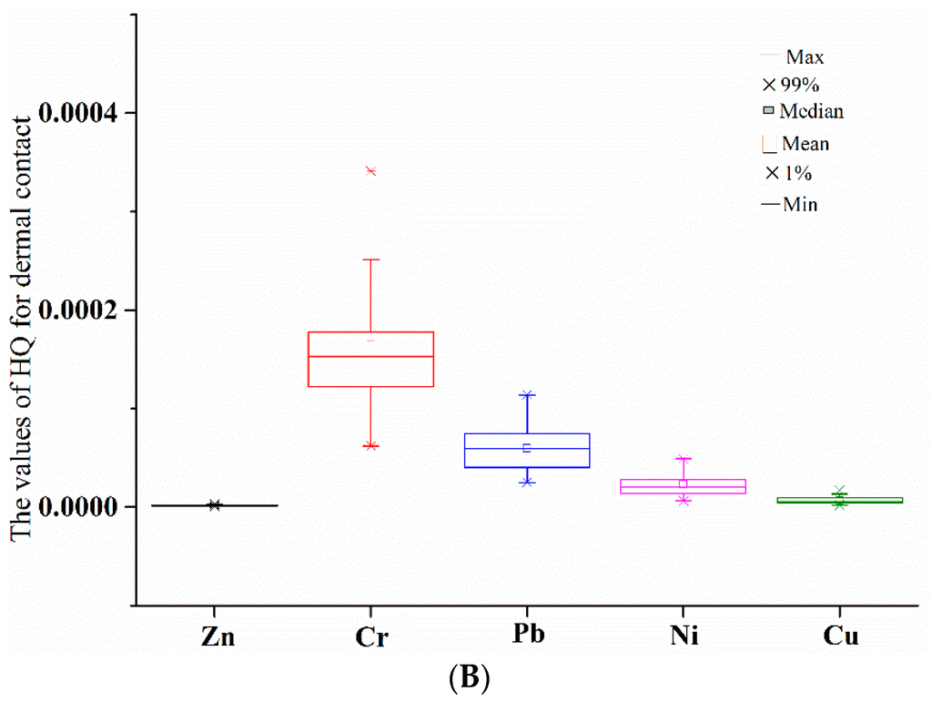 Human health risk assessment was conducted with hazardous quotients (HQs) and the results are represented in Table 5. Hazardous index (HI) is the sum of HQ. The values of HI in all the sampling sites were smaller than 1. The values of HQs for exposure of each heavy metal through pathways of ingestion and dermal contact to bed sediment from all the sampling sites were smaller than 1. As represented in Figure 5A,B, among five heavy metals, the values of HQs for ingestion and dermal contact both decreased in the order Cr > Pb > Ni > Cu > Zn. The values of HQs for exposures of all the heavy metals through ingestion were two or three orders of magnitude higher than through dermal contact.