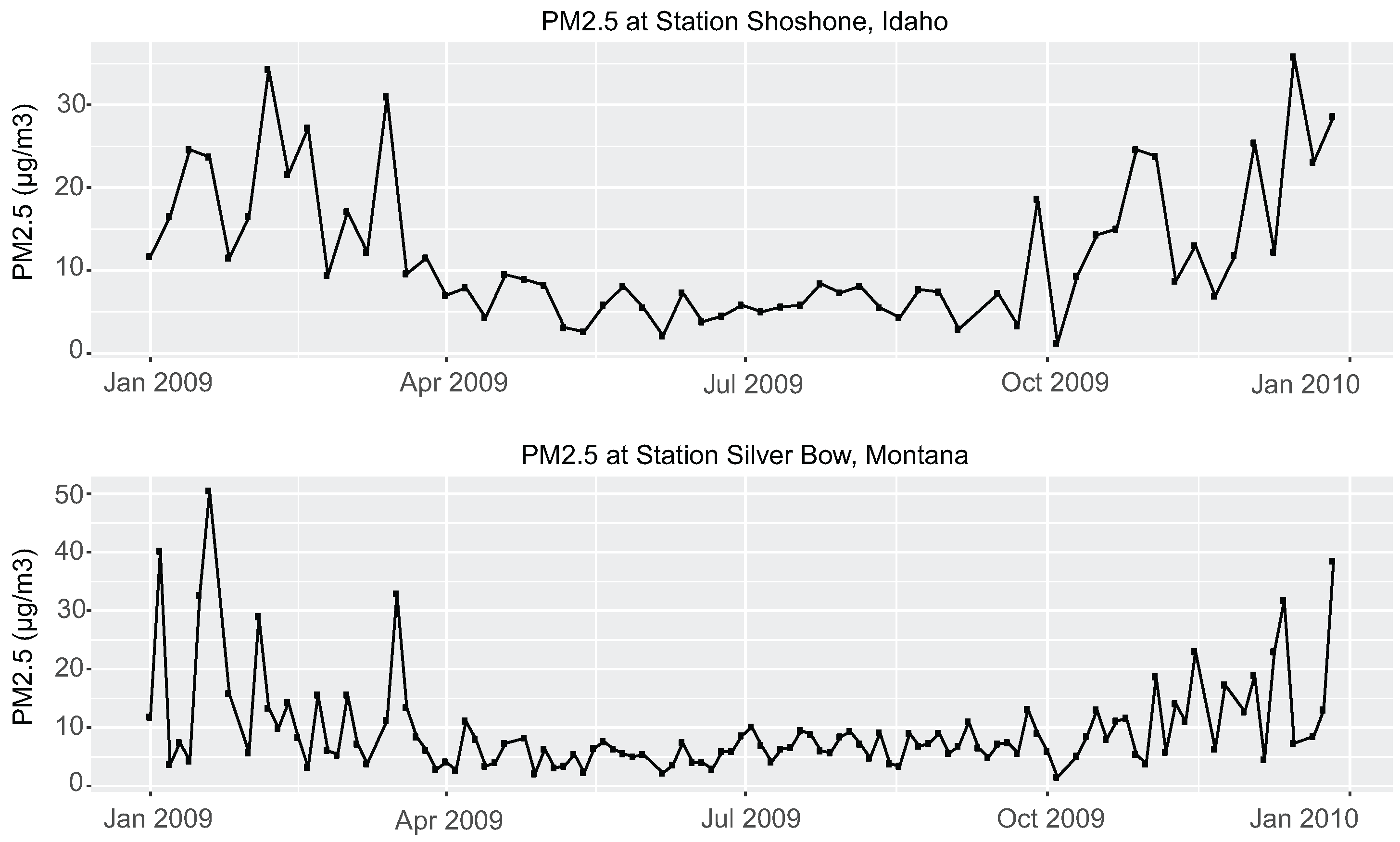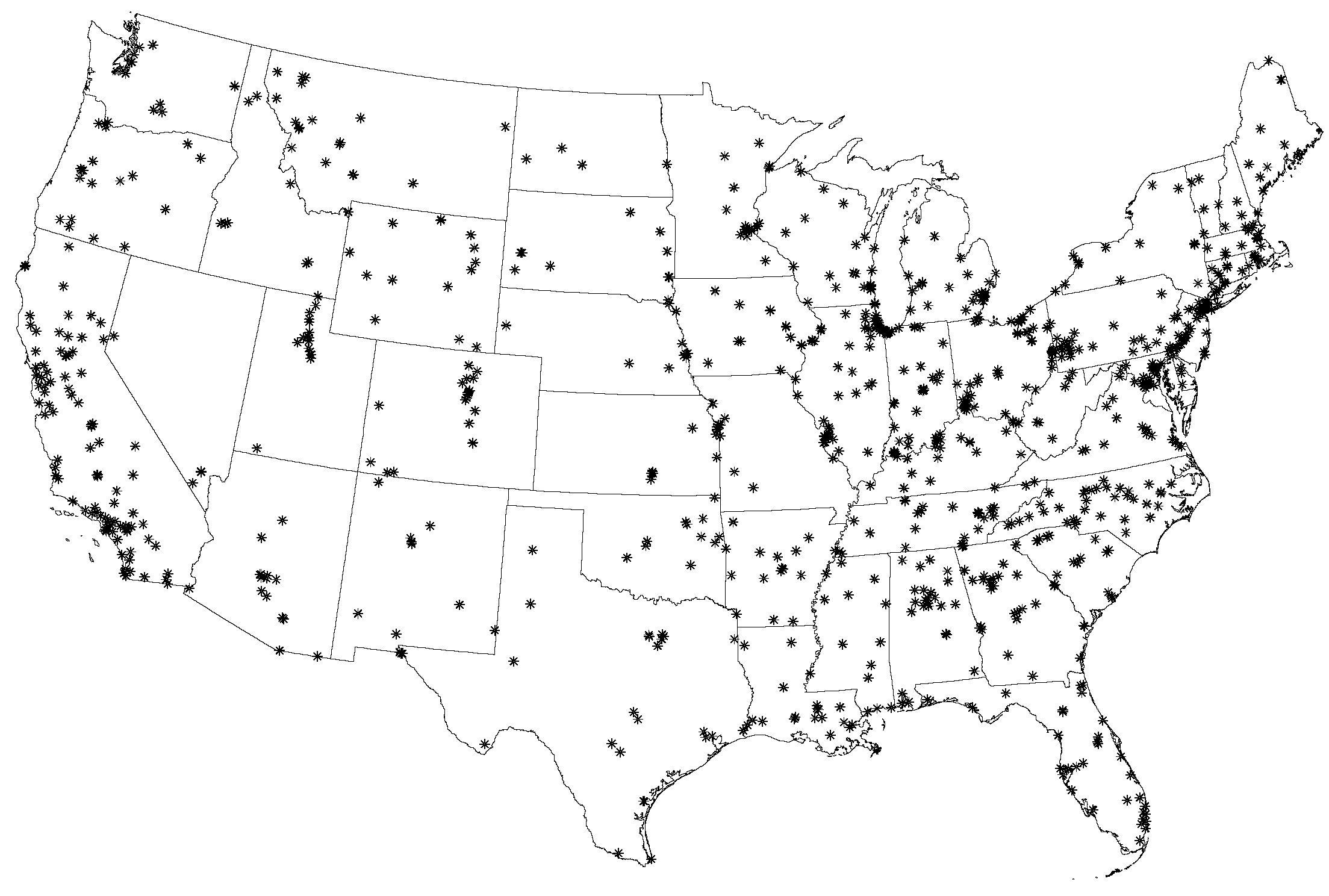 - Finally, there is a limitation in the currently implemented SF-based algorithm with respect to missing data close to some boundaries of the contiguous United States. For example, along the west coast in Oregon and Washington, there are monitoring stations relatively far away from the coastal border. Because of missing data, an unrealistic stripe next to the coast is visible in our map presentations of the interpolated results. In order to avoid this type of problem, we will need additional measurements along the coast, or use meshless interpolation methods such as IDW with a limited number of neighboring measurements in future work.