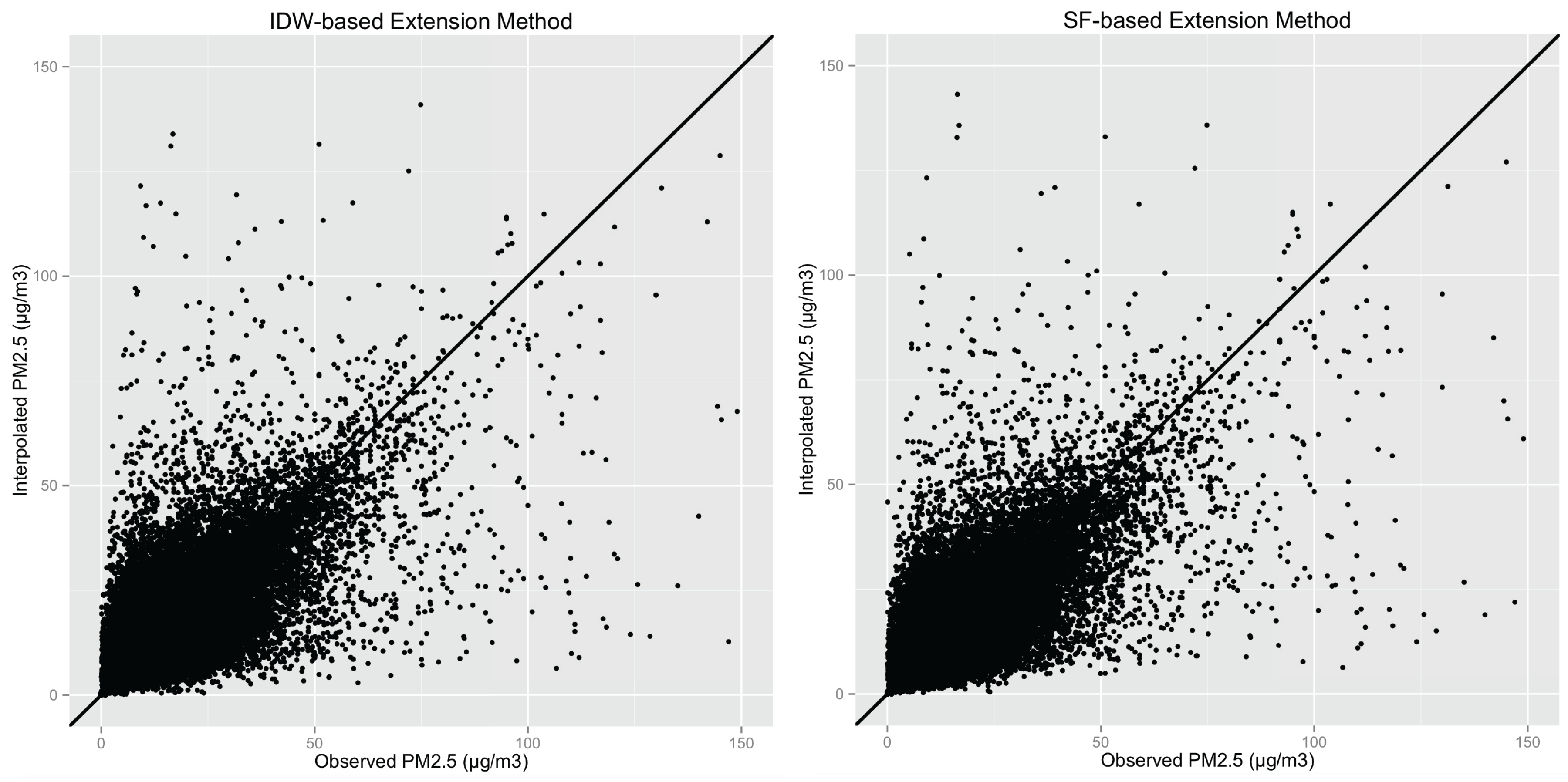 - The SF-based and IDW-based methods are deterministic methods. In this paper, we did not compare our methods with geostatistical interpolation methods such as Kriging, neural networks, and land use regression. In future work, we plan to develop multidimensional and stochastic spatiotemporal interpolation methods suitable for ambient air pollution data (NO2, O3, PM2.5, and PM10) by incorporating factors associated with the environmental exposure of interest, and then make comparisons with other commonly-applied geostatistical interpolation methods.