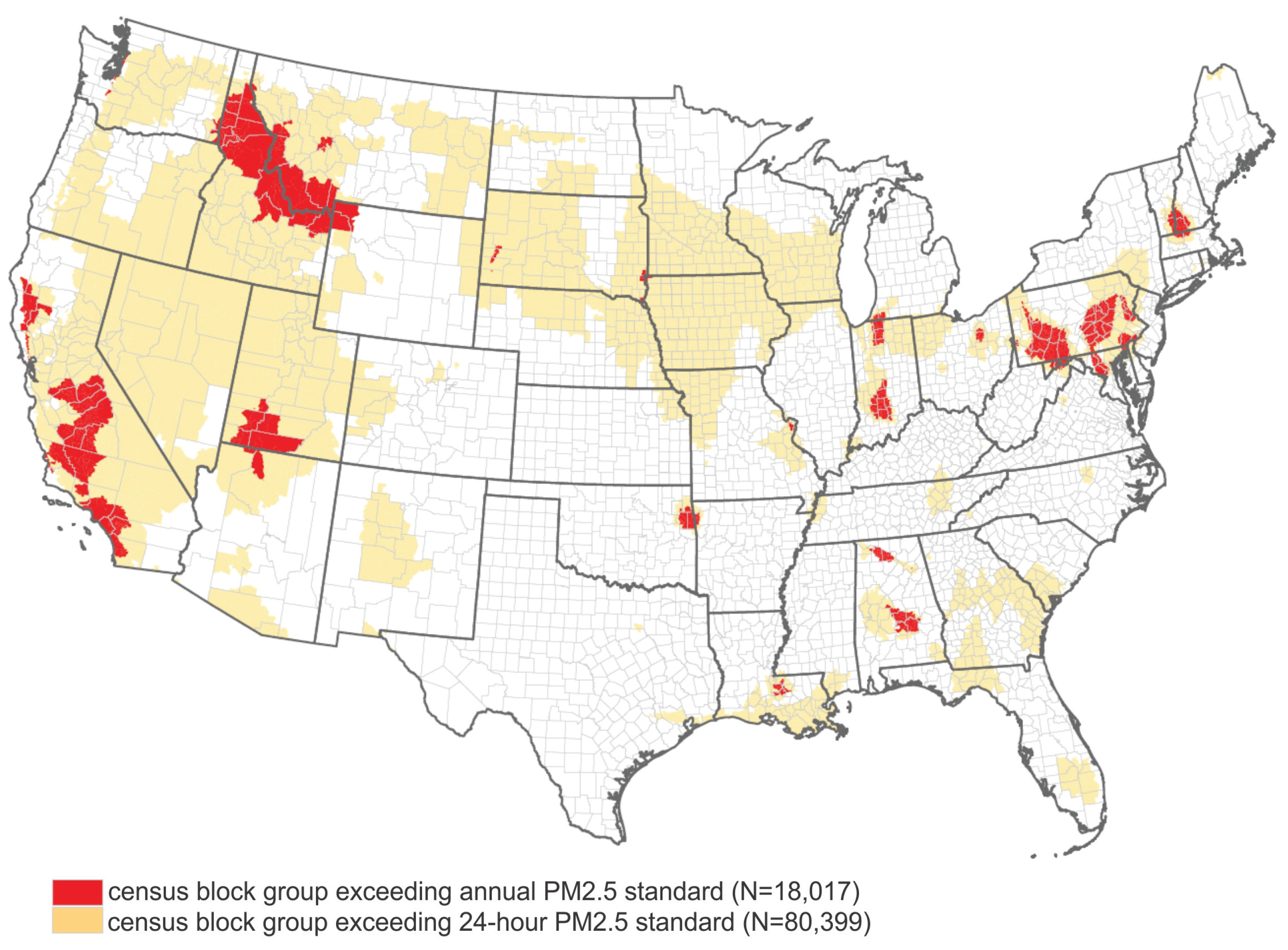 - more than one-third of the U.S. population () residing in census block groups where PM2.5 exceeded for at least one day in 2009.