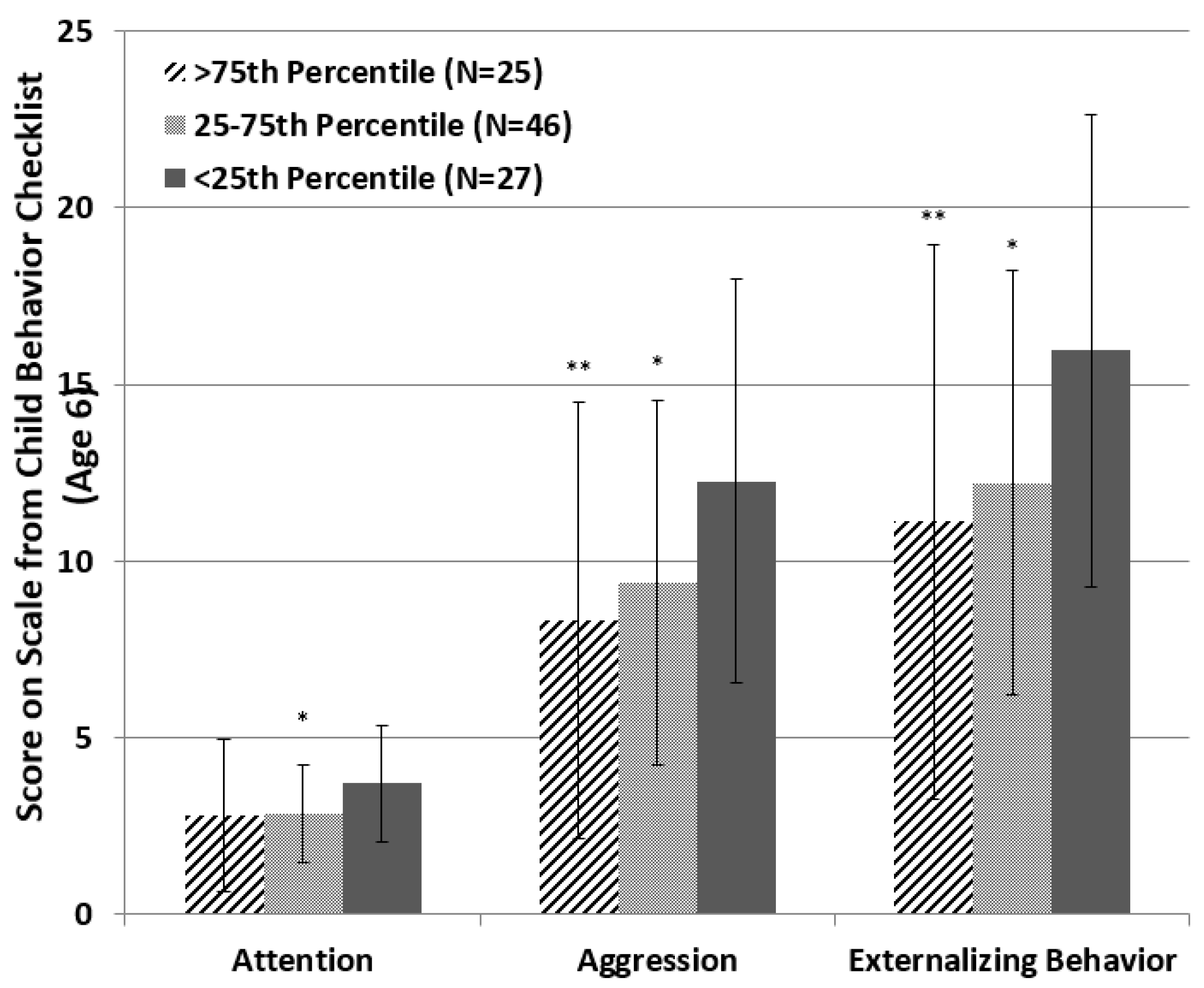 Score for externalizing behaviors at age 6 among children who tested for hemoglobin levels at age 4. * Trending significant (0.05 < p ≤ 0.1) differences in behavior score when compared with the <25th percentile group. ** Significant (at α = 0.05) differences in behavior score when compared with the <25th percentile group.
