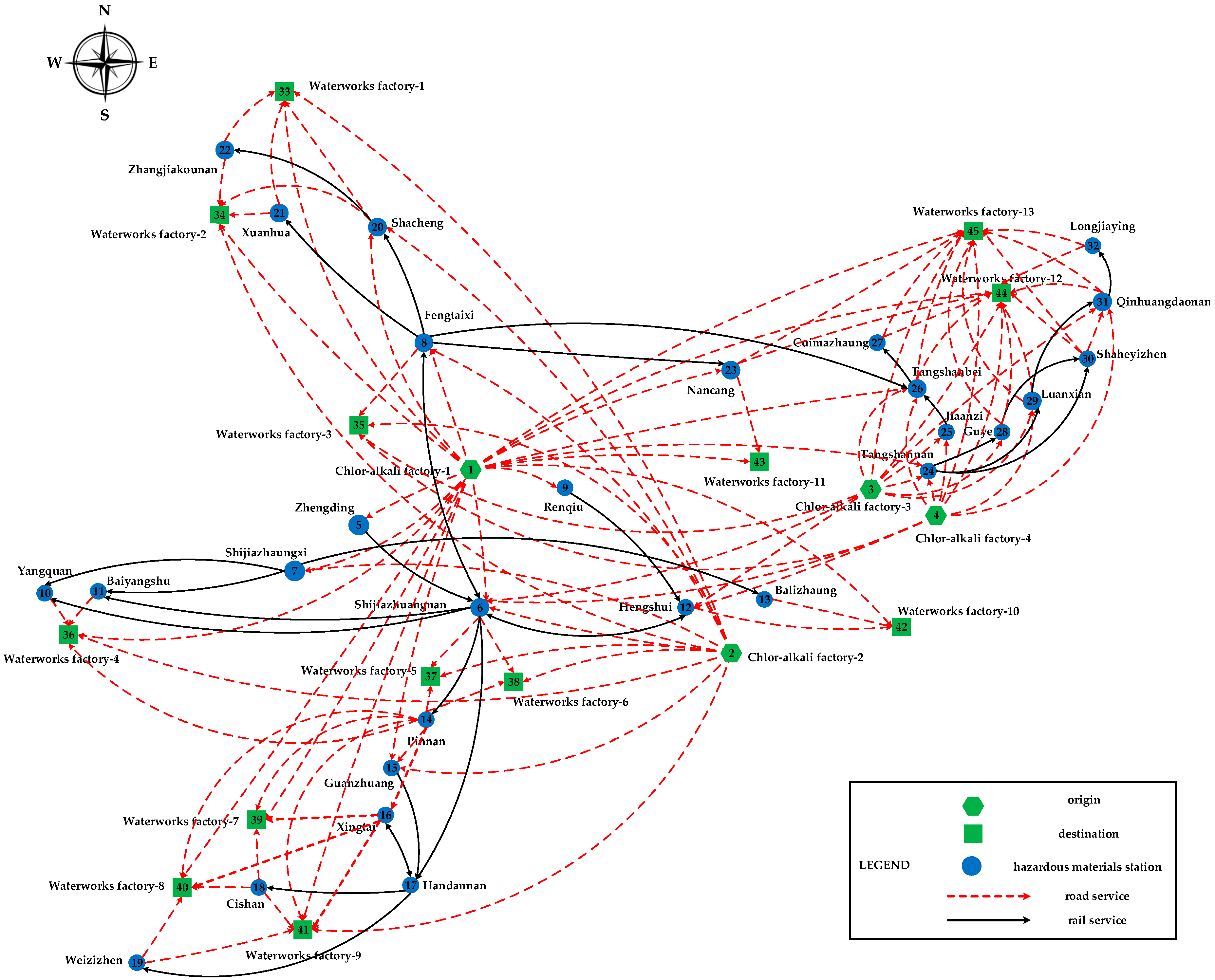 In this study, in order to further develop the road–rail multimodal routing problem of hazardous materials, we discuss it from the operational level of network planning, and comprehensively consider the following formulation characteristics.
