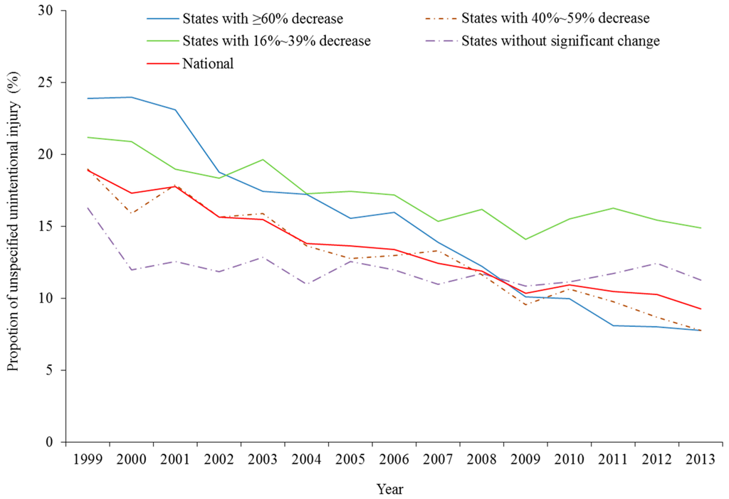 The proportion of injuries reported with an unspecified cause of injury can substantially affect the reported morbidity and mortality rates of cause-specific injury data. Researchers can approximate this proportion using the proportion of injury deaths with unspecified external cause codes [,,], and some researchers suggest a proportion larger than about 10% [] or 20% [] of total deaths assigned to ill-defined or non-specific codes is considered “poor quality” or “unsatisfactory”. The National Center for Health Statistics (NCHS) within the U.S. Centers for Disease Control and Prevention has conducted special studies and expanded outreach to physicians and others completing birth and death certificates, with a goal to improve data quality and reduce the proportion of injuries coded with an unspecified cause of injury []. Much of this work has focused on older adults aged 65+, where a high proportion of errors occur, and two studies suggest these efforts have been successful over the last two decades at the national level [,]. Stevens and Rudd reported a trend toward more-specific reporting of circumstances for falls for Americans aged 65 years and older from 1999 to 2010, although total deaths remained unchanged []. Similarly, Hu and Mamady reported that the proportion of unspecified unintentional injuries decreased from 18.9% to 10.9% between 1999 and 2010 for the elderly aged 65+ at the national level, and that the decrease in unspecified unintentional injury mortality was correlated with changes in mortality rates from motor vehicle crashes, falls, poisonings, drownings, suffocations, fires/burns, and natural/environmental disasters []. These results suggest that efforts to improve specificity in reporting the cause of injury mortality may have resulted in improved data quality and more accurate tallying of the causes of injuries among older adults nationally.