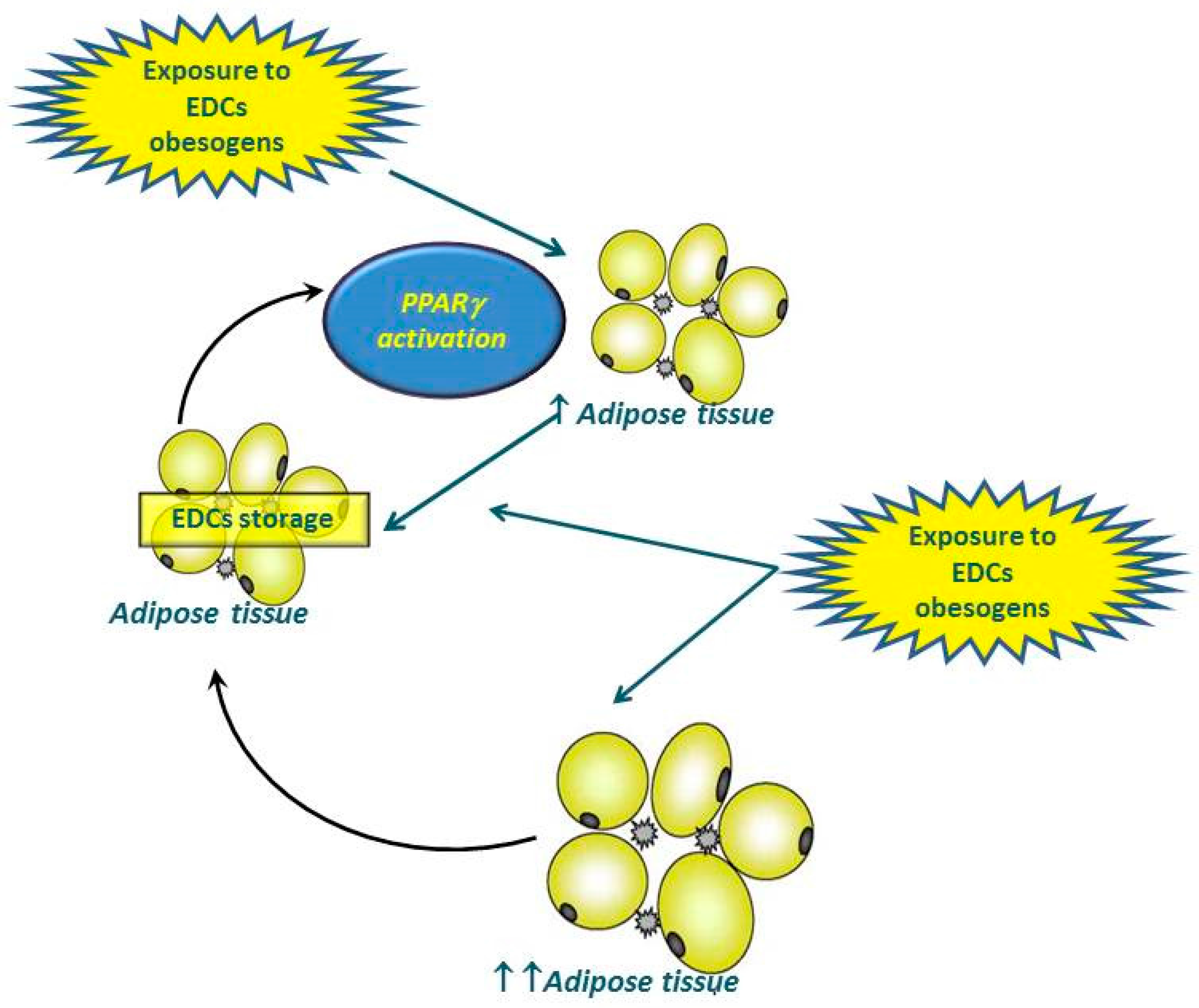 The adipocytes are endocrine cells producing and receiving endocrine signals from different endocrine tissues and, as such, susceptible to EDCs, especially in critical windows of development. “Obesogen” actions of EDCs should be considered parts of a very complex scenario resulting from multiple and bidirectional relationships between EDCs and genetic, epigenetic and environmental factors, including parental diet/exposure, lifestyle, dietary habits, gut microbiota. In addition, it should be considered that the “obesogen” mechanisms operating early in life might vary enormously later in life due the chronic exposure to EDCs throughout the entire life span of the exposed individuals.