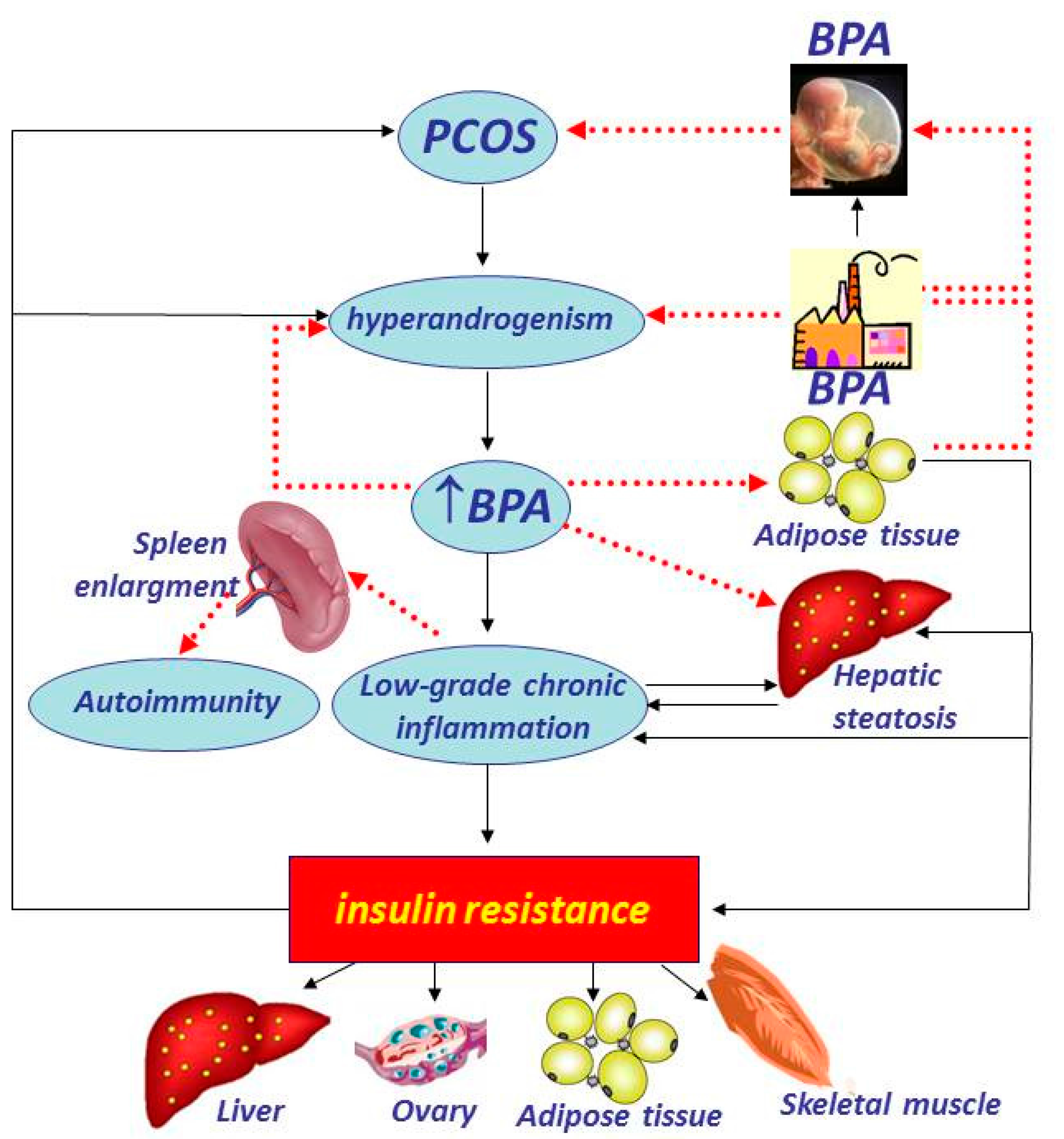 A possible pathway involving BPA, liver-spleen axis, hyperandrogenism, and low-grade inflammation in pathogenesis of the polycystic ovary syndrome taking into account the suggested role of BPA as EDC for the “environmental obesogen hypothesis”, and considering the possible relationship between in utero exposure to BPA and PCOS pathogenesis. Besides a direct hepatotoxic and adipogenetic effect, BPA could act as pro-inflammatory primer, via macrophage activation and pro-inflammatory cytokine hypersecretion, being spleen enlargement as marker of this process, with a possible link with immune/autoimmune derangement in women with PCOS. PCOS exposure to low-chronic BPA doses might initiate or exacerbates obesity and IR, while in turn, BPA influences androgen metabolism. BPA, Bisphenol A; EDCs, endocrine-disrupting chemicals; PCOS, polycystic ovary syndrome; IR, insulin resistance.