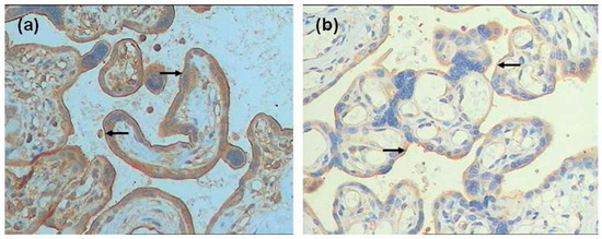 All slides were examined independently by two pathologists who were blinded to the patients’ clinical data. The staining intensity of TfR, ferroportin, and Hepcidin expression in all specimens was semi-quantitatively scored. Five fields were randomly selected and 15 images of each sample from each group were taken with the microscope settings unaltered (×400 magnification). Staining intensity in syncytiotrophoblast (STB) cells was scored basing on the combination of staining intensity of immunohistochemical images with the percentage of positive cells, using a previously published method [17]. Briefly, no staining was scored as 0, 1%–10% of positively stained cells was scored as 1, 11%–50% as 2, 51%–80% as 3, and 81%–100% as 4. Staining intensity was rated on a scale of 0–3, with 0 = negative, 1 = weak, 2 = moderate, and 3 = strong. The raw data were converted by multiplying the quantity and staining intensity scores. Negative controls were stained without prior incubation with the primary antibody.