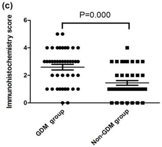 Immunohistochemistry images demonstrated that the lower expression of Hep on the membrane of the basal cells (arrow) in the GDM group (a) compared to that in the non-GDM group (b) (×200 magnification). A lower immunohistochemistry score was found in the GDM group compared with the non-GDM group (c) p = 0.044.