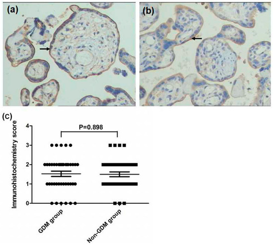 Immunohistochemistry images demonstrated that TfR1 was expressed on the membrane of maternal surface (as arrows) and there were no significant difference being found between the GDM group (a) and non-GDM group (b) (×200 magnification). No significant difference were foundin immunohistochemistry score between the two groups (c, p = 0.898).