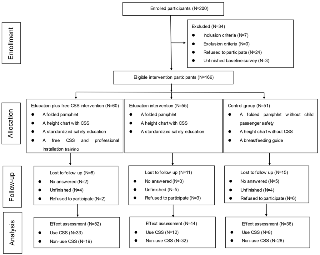 Two hundred parents of newborns in the two hospitals during the research period were introduced to the research and invited to participate in the study. Of these, 166 parents agreed and were enrolled in the study, while 76 were excluded (24 refused to participate in the study, 43 were not eligible, and nine had incomplete baseline surveys) (see Figure 1). Of 166 enrolled parents, 60 were in the education plus the free CSS intervention group, 55 were in the education intervention group and 51 were in the control group. Three months after the interventions, 52 parents who remained in the education plus the free CSS intervention group, 44 in the education intervention group and 36 in the control group completed the follow-up surveys. Of 34 parents who were lost to follow-up, 10 were unable to contact, 11 refused to participate and 13 had incomplete telephone follow-up (see Figure 1).