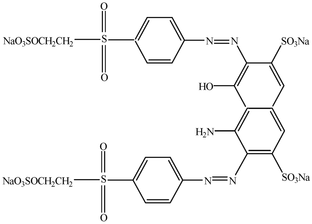 Molecular structure of Reactive Black 5 diazo compound with two N double bound N bounds.