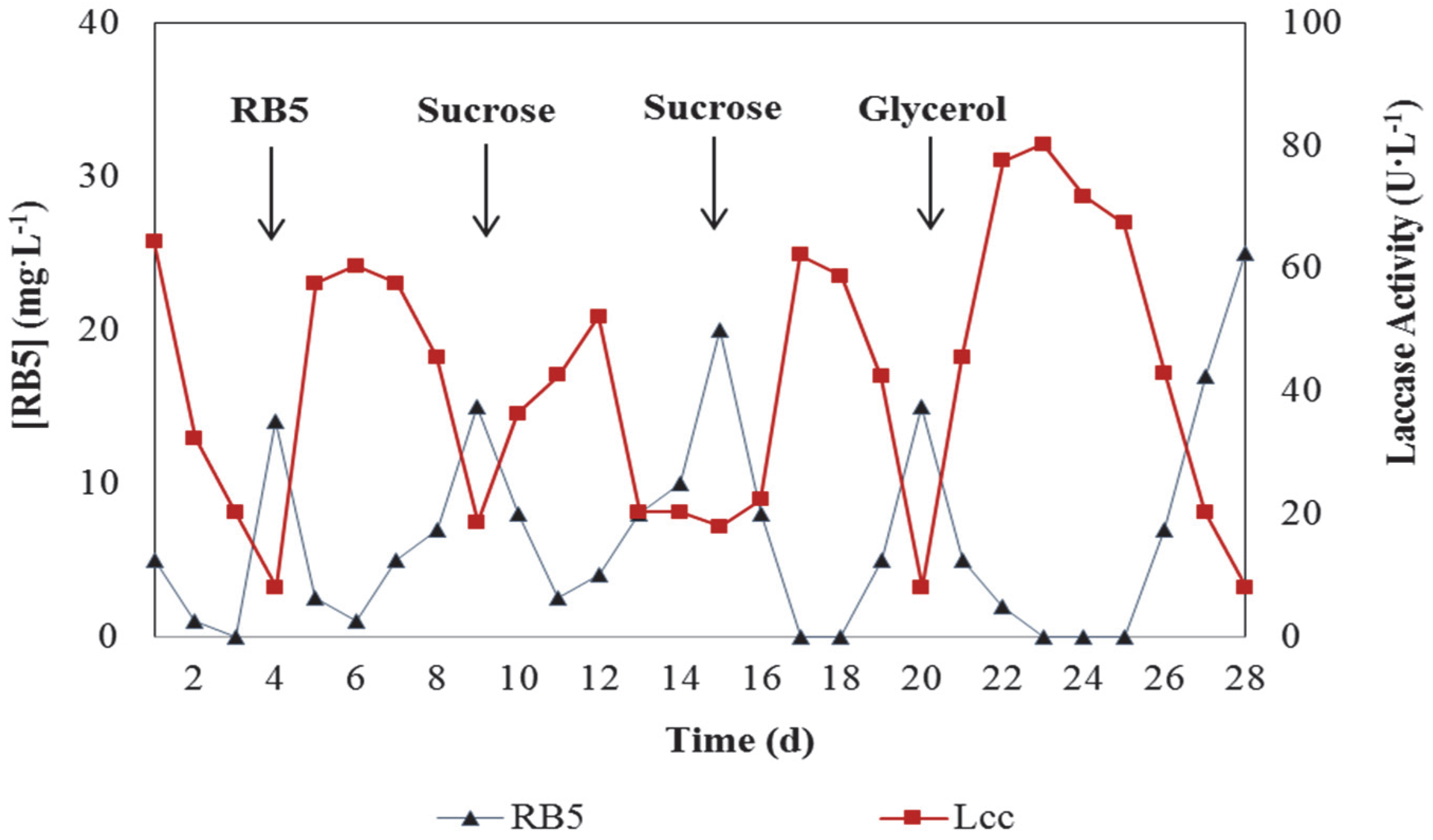 Time course of Reactive Black 5 (RB5, 0.1 g·L−1 at pH 9.5) concentration and Lcc activity using T. versicolor. The bioreactor operated in batch mode with LCM until total decolourisation and was then continuously fed with RB5 at day 4. Rows indicated when the pulses of different carbon sources at concentration of 5 g·L−1 were added to the RB5 solution at days 9, 15 and 20.