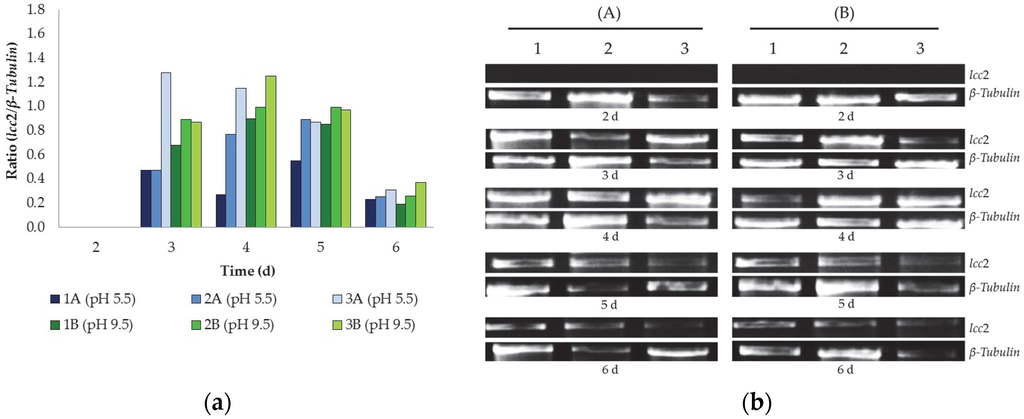 The pH of the medium was only adjusted to 9.5 at the beginning of the assay employed herein and at the end of the assay the pH of the medium varied between 4.5 and 5.0. Nevertheless, T. versicolor MUM 04.100 was able to express lcc2 under alkaline conditions (Figure 4). This finding corroborates previous studies [5,6], which report good Lcc performance under alkaline conditions for the same strain.