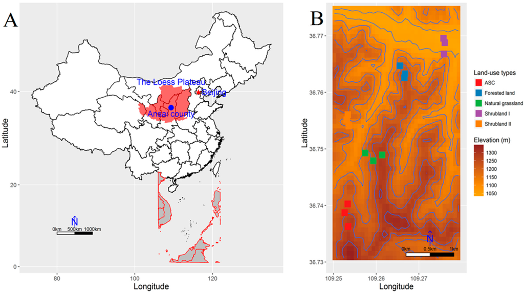 Study area and soil-sample sites. (A) Location of the Loess Plateau of China and Ansai county; (B) distribution of the soil-sample sites in the various land-use types.