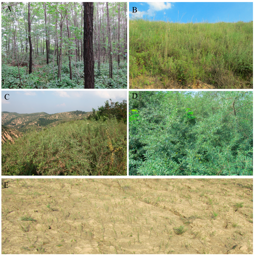 Photographs of the land-use types. (A) Forested land with Robinia pseudoacacia; (B) grassland with Stipa bungeana and Artemisia sacrorum; (C) shrubland I with Caragana microphylla; (D) shrubland II with Hippophae rhamnoides; and (E) sloped cropland abandoned for <1 year.