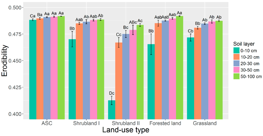 The erodibility in the 0–10 cm layer of all older land-use types and in the 10–100 cm layers of shrubland II and grassland were significantly lower than in ASC (Figure 3). Erodibility generally tended to increase with soil depth and remained unchanged below 20 cm.