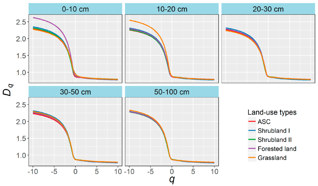 Selected examples of Rényi spectra (Dq) are shown in Figure 4. These curves were calculated for 0.2 q steps in the range of moments from −10 to 10. The Dq spectra were typical sigmoidal curves, notably decreased as q increased, and differed in shape among land-use types in both the 0–10 and 10–20 cm layers.