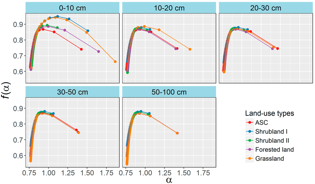 Singularity spectra, f(α), of selected samples are shown in Figure 5. The shapes of the f(α) spectra of the selected samples varied greatly among the land-use types for the same soil layers, especially the 0–10 and 10–20 cm layers, even though the spectra were characterized by a typical concave downward shape. All f(α) spectra had long left components, but the right components were quite different.