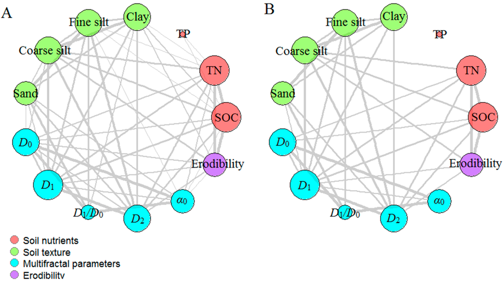 Network plot showing the associations between the multifractal parameters and selected soil properties and erodibility. (A) Significant correlations (p < 0.05); and (B) moderately or highly significant correlations (r > 0.4, p < 0.05).