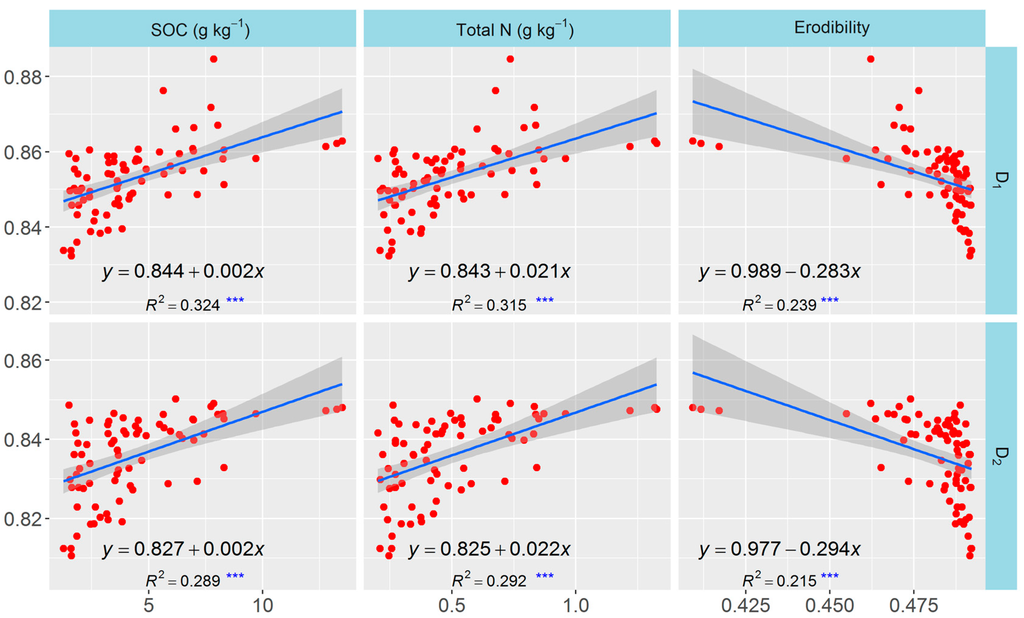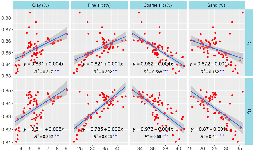 The correlation network including the traits of soil nutrients, texture, erodibility, and multifractal parameters were plotted to test the relationships among these parameters. All significant correlations (p < 0.05) were visualized as edges in the network (Figure 6A), and the network was simplified based on the correlation coefficients and statistical significance (Figure 6B, r > 0.4 and p < 0.05). The size of a vertex in the network was dependent on the node degree: the larger the node degree of one vertex, the stronger the connection with other vertices, indicating a more important corresponding trait in the network. The vertices for clay, fine-silt, coarse-silt, sand, SOC, and TN contents and for D0, D1, D2, and erodibility were obviously larger than those for the other parameters. Considering the importance of multifractal parameters and their relationships with other soil properties, D1 and D2 were selected for the analyses of linear regression to quantify the relationships. D1 and D2 were linearly correlated positively with SOC and TN contents but negatively with erodibility (p < 0.001) (Figure 7). D1 and D2 were correlated positively with clay and fine-silt contents, but correlated negatively with coarse-silt and sand contents (p < 0.001) (Figure 8). The slope coefficients of the regression lines were highest for the models between erodibility and D1 and D2 (−0.283 and −0.294, respectively), and the slope coefficients of the regression lines were higher for the models between clay content and D1 and D2 (0.004 and 0.005, respectively) than for the other particle-size classes.