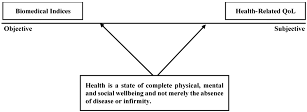 Approaches to health assessments. Subjective evaluations (i.e., HRQOL) capture the wellbeing aspects of health, while objective biomedical measures index the disease and infirmity aspect.