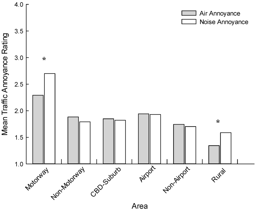 A primary objective of this research was to document the degrees of air pollution annoyance and noise annoyance across areas differentiated by infrastructure, traffic volumes, and population density. As expected, the highest levels of annoyances were recorded in the Auckland Motorway sample, and the lowest in the Wellington Rural sample. Our prediction of equivalent air quality versus noise annoyance levels within samples obtained from city locales was largely upheld, though the Auckland Motorway example was an exception. In this sample, the mean noise annoyance ratings were significantly higher than the air pollution annoyance ratings. This prediction rested on the assumption that, while different sectors of the city may be exposed to differing levels of air and noise pollution, within each sector, the exposures would be roughly equivalent (i.e., the detection of air pollution would be proportionally related to noise exposure and vice versa). Speculatively, it may be that an interaction between the physical environment of the motorways and meteorological factors is effectively dispersing the air pollution, while no such attenuation of noise occurs. Such a situation would also occur in rural areas, albeit at lower exposure levels, and accordingly we predicted that for rural areas, noise annoyance would be greater than air pollution annoyance, as was the case for our data.