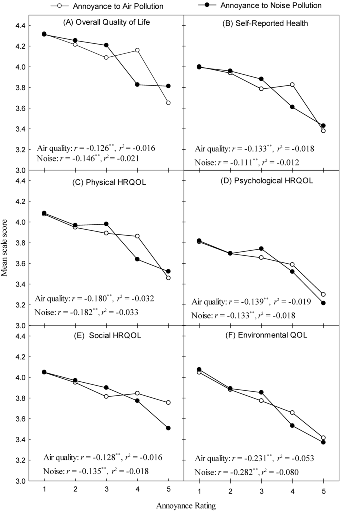 Few studies have utilized HRQOL measures to assess the association between of air quality and noise and health, but those that have tend to report inverse relationships between the two (e.g., [55]). Qualitative analyses of our results (re: Figure 3) suggest a strong coupling between air pollution annoyance and noise annoyance on their effects on facets of quality of life. Disentangling the effects of the two sources of annoyance remains an ongoing challenge. Unsurprisingly, air quality and noise annoyance was associated most with Environmental QOL, though across all facets of QOL, a consistent negative trend was noted, that is, after controlling for relevant variables, an increase in annoyance was associated with a decrease in QOL. Thus, while it can be concluded that the effect of air quality and noise annoyance on QOL is modest, it is consistent with findings showing dose-response relationships between exposures and objective health measures such as hypertension (e.g., [56]).