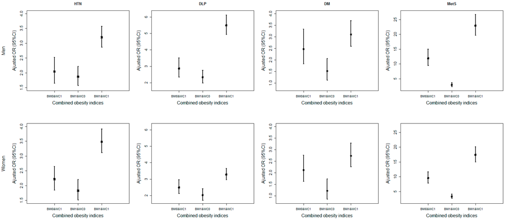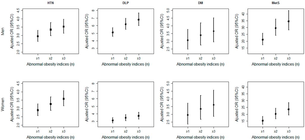 In our study, we investigated four obesity indices, BMI, WC, WHR and WHtR, together with their clustering in predicting CVD risk factors and MetS. It turned out that the participants were at an increasing risk with the of abnormal obesity indices that one had. Generally, the adjusted ORs in males were higher than those in females, especially for DLP and MetS. One possible reason was that the prevalence of abdominal obesity in males might be more common than that in females, and the other possible reason was that females tended to control their weight in contrast with males [38,39]. Therefore, more effective attention and intervention should be paid to obesity, especially abdominal obesity in males.