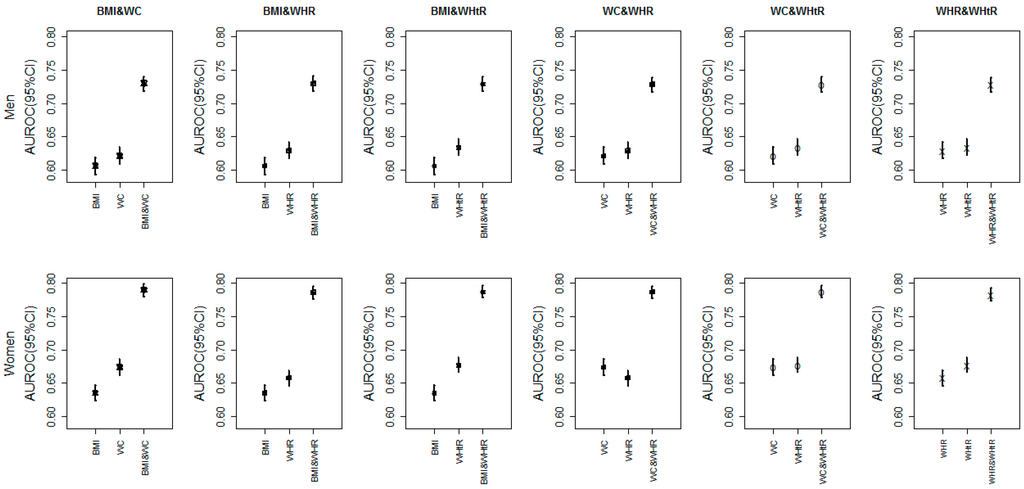 Furthermore, using the combination of two indices could improve the AUROC on different levels, and the rise was up to 19.45%. Meanwhile, a number of previous studies also suggested that the combination of two indices had a better predictive capacity than either alone [40,41]. The reason might be that the combinations of different indices incorporated the information both in the amount of fat and in the distribution of fat. Similarly, the rise of AUROC for HTN and DM were larger than DLP and MetS, which might be due to the fact that DLP and MetS were primarily influenced by abdominal obesity; while HTN and DM also depended on the amount of fat to some extent. In addition, BMI and WC were the preferable combinations in general, which was in agreement with Zhu et al.’s and Ricketts et al.’s study [40,42]. Besides, the AUROC of younger age groups was the largest in most cases, which implied that obesity might have much more impact on young people.