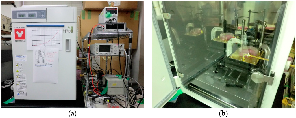 The built-in incubator of the 60 GHz exposure system (a) and an inside view of the incubator (b). The chamber of the exposure system was maintained under controlled conditions similar to those in an incubator, i.e., an atmosphere of 95% air and 5% CO2 at a relative humidity of >95% and a temperature of 37 °C.