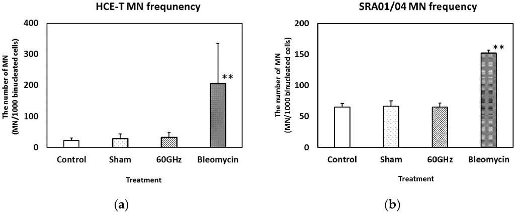 Micronucleus frequency in cells exposed to millimeter-wavelength radiation at 60 GHz for 24 h: HCE-T cells (a) and SRA01/04 cells (b). Treatment with bleomycin (10 µg/mL) provided the positive controls. Data are presented as the mean ± SD from three independent experiments. Asterisks ** indicate p < 0.01. f = 0.1, (1−β) = 0.9903.