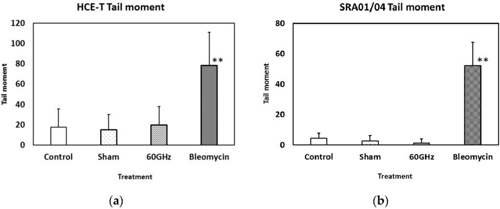 Values of a comet parameter (tail moment) for cells exposed to millimeter-wavelength 60 GHz radiation for 24 h: HCE-T (a) and SRA01/04 (b). The positive control was treatment with bleomycin (10 µg/mL). Data are presented as the mean ± SD from three independent experiments. Asterisks ** indicate p < 0.01. f = 0.1, (1−β) = 0.2193.
