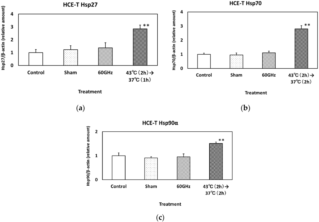 The expression of Hsp27 (a); Hsp70 (b) and Hsp90α (c) in HCE-T cells exposed to 60 GHz radiation for 24 h. The positive control underwent heat treatment at 43 °C for 2 h. Data are presented as the mean ± SD from three independent experiments. Asterisks ** indicate p < 0.01.