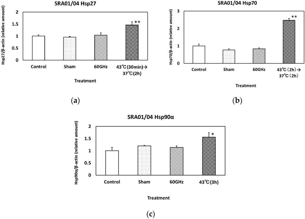 The expression of Hsp27 (a); Hsp70 (b) and Hsp90α (c) in SRA01/04 cells exposed to 60 GHz radiation for 24 h. The positive control underwent heat treatment at 43 °C for 30 min (Hsp27), 2 h (Hsp70) and 3 h (Hsp90α). Data are presented as the mean ± SD from three independent experiments. Asterisks * and ** indicate p < 0.05, and 0.01, respectively.