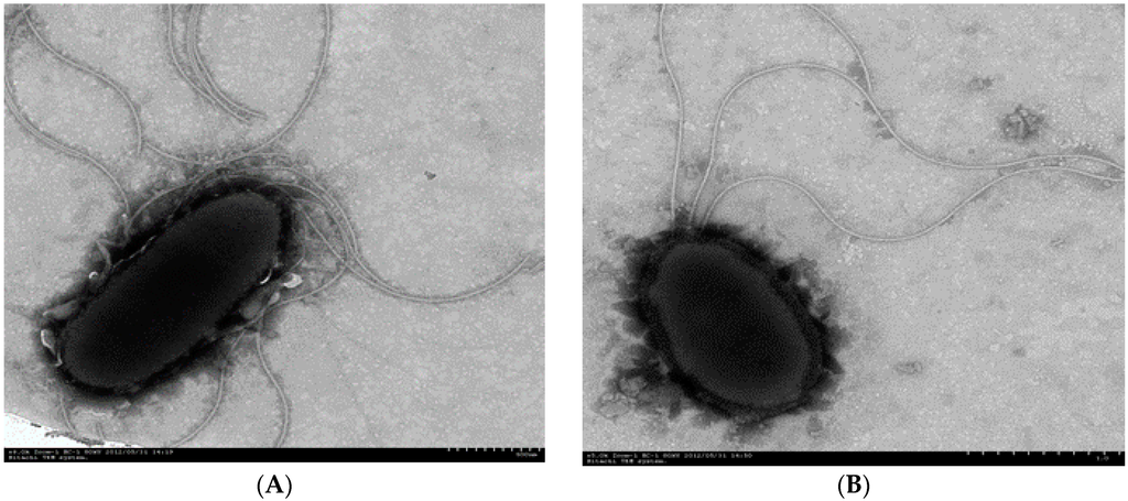 Electron micrographs of strain P1 ((A): ×6.0 K Zoom-1 HC-1 80 kV) and strain P3 ((B): ×5 K Zoom-1 HC-1 80 kV).