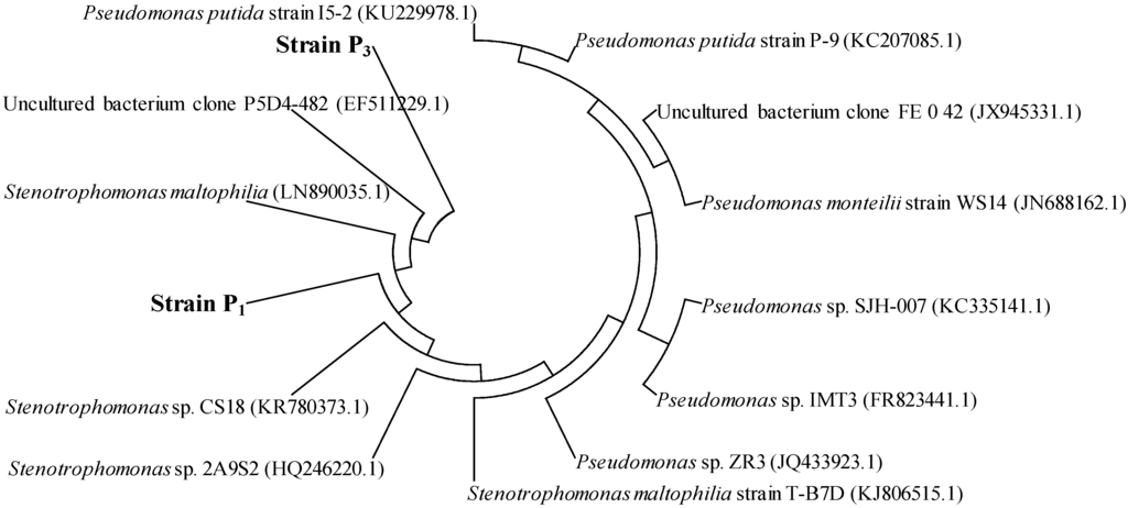 Strains P1 (GenBank KX594417) and P3 (GenBank KX594418) were isolated from Conyza canadensis and Trifolium pretense L., respectively, which could utilize PHE (up to 200 mg/L) as the sole source of carbon and energy. The cells of the two bacterial strains were short, nonsporing, acapsular, aerobic, and Gram-negative rods. Moreover, the cell size of strain P1 was ten times larger than that of strain P3 (Figure 1). Based on BLAST sequence comparison, the 16S rRNA of strain P1 was 99.98% similar to that of Stenotrophomonas maltophilia, while the 16S rRNA of strain P3 was 99.99% similar to that of Pseudomonas monteilii and 99.97% similar to that of Pseudomonas plecoglossicida. The phylogenetic tree shown in Figure 2 includes strains P1 and P3 and related species. These comparisons showed that strain P1 could be considered a Stenotrophomonas sp. strain, and strain P3 could be considered a Pseudomonas sp. strain. In previous reports Pseudomonas has been found in PAH- degrading consortia isolated from mangroves [15] and from leaf soil [27]. Stenotrophomonas has been previously reported to degrade high molecular weight PAHs [28].