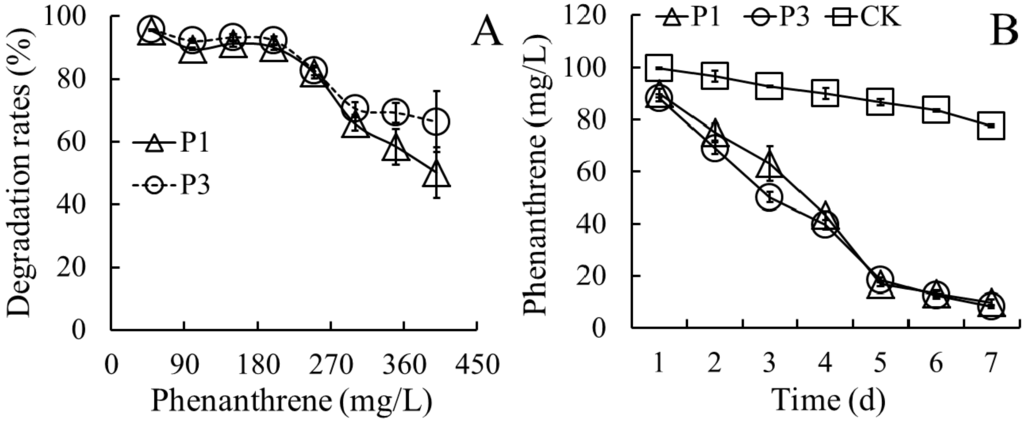 As shown in Figure 3A, PHE was effectively degraded by strains P1 and P3 after 7 days in MS medium supplemented with PHE at 50, 100, 150, 200, 250, 300, 350, and 400 mg/L, respectively. When the initial PHE levels in the medium were higher than 250 mg/L, more PHE was degraded by strain P3 than that degraded by strain P1. Strain P3 degraded PHE more efficiently than strain P1 when the levels of PHE in the media were higher than 250 mg/L. The degradation rates of PHE significantly decreased with increasing levels of PHE. When the levels of PHE in the media were less than 200 mg/L, the degradation of PHE by both strains was more than 90%. However, strain P1 degraded 81.8% PHE in medium containing 250 mg/L of PHE and 50.2% PHE in medium containing 400 mg/L of PHE. Strain P3 degraded 82.7% PHE in medium containing 250 of mg/L PHE and 66.4% PHE in medium containing 400 mg/L of PHE.