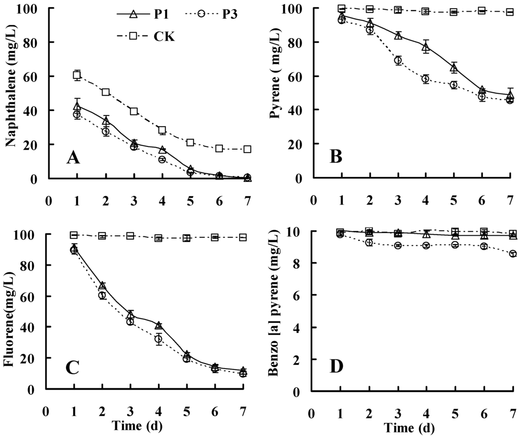 Strains P1 and P3 reflecting highly degrading-PAHs abilities were selected for further investigation. The cells were used as inocula in degradation studies after reaching the stationary phase through suspension in fresh MS medium at an optical density OD600 nm of 1.0 (108 CFU/mL). The degradation of PAHs was monitored in 50-mL flasks containing 20 mL of MS medium containing PAHs as the sole carbon sources, and 1-mL aliquots of the strain suspension were added to the prepared flasks. The control flasks were inoculated with sterilized MS medium to assess the abiotic effects on the stability of the PAHs. All cultures were incubated on a rotary shaker (150 rpm) at 28 °C for 7 days. Triplicate flasks from each treatment were retrieved for detection of the PAH concentrations.