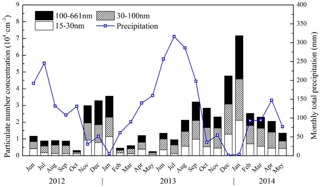 Continuous hourly number size distributions of particles between 15.1 nm to 661.2 nm in diameter were measured using a scanning mobility particle sizer (SMPS, model 3936L75-N, TSI Inc., Shoreview, MN, USA) from 1 June 2012 to 31 May 2014. The ambient air was sampled by the SMPS via an approximately 5 feet long and 0.5 inch wide stainless steel tube through the roof of the laboratory, which is about 50 feet above the ground in Wuhan University, with the sheath and sample flows kept stable at 3.0 L·min−1 and 0.3 L·min−1, respectively. A bipolar charger in an electrostatic classifier (EC, model 3080, TSI Inc., Shoreview, MN, USA) was used to charge the particles to a known charge distribution. These charged particles were classified by a differential mobility analyser according to their traverse ability in an electrical field, and a condensation particle counter (CPC, model 3775, TSI Inc., Shoreview, MN, USA) was used to count the number concentration of particles in a respective size range. To ensure the quality of data, the volume of n-butyl alcohol and operational parameters, including temperature, voltage, and flow rate, were checked daily, and the valve connector was cleared weekly. Furthermore, the equipment software corrected for the instrumental multi-charged effect and diffusional loss. Excluding missing data and problematic data, 676 integrated days of valid particle number concentrations were recorded from June 2012 to May 2014.