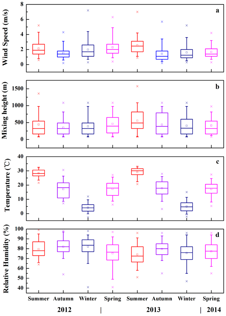 Seasonal variations in wind speed (a); mixing layer height (b); temperature (c); and relative humidity (d) in Wuhan during the two-year experiment. The upper and lower edges of the boxes represent the 25th and 75th percentiles; the horizontal line and square in the box show the median and mean values, respectively; the lower and upper whiskers of each box represent the 5th and 95th percentiles, respectively; and the lower and upper crosses represent the 1st and 99th percentiles, respectively.