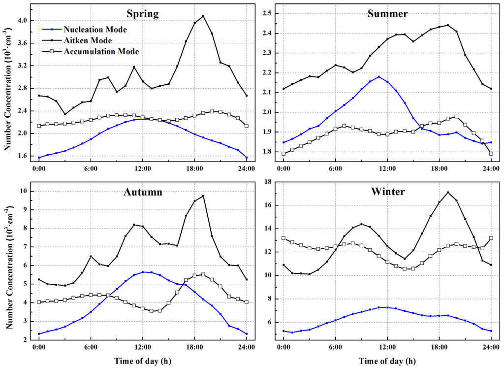 Diurnal variations in averaged particle number concentrations in the nucleation, Aitken, and accumulation modes during the four seasons.