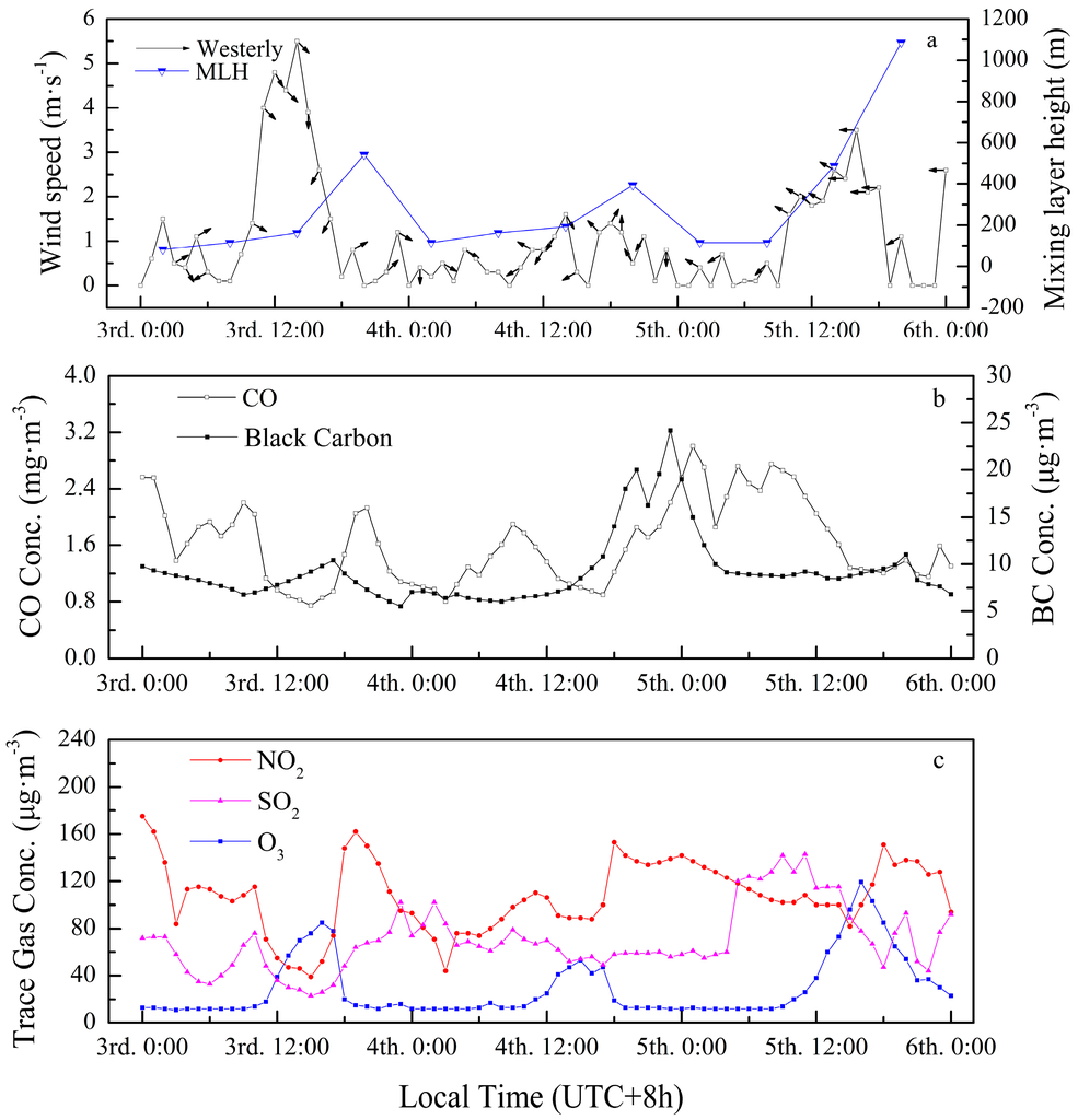 Concentration of trace gases averaged from three sites and black carbon with meteorological parameters on three consecutive winter days from 3 January to 5 January 2014: (a) hourly variations of wind speed and mixing layer height; (b) hourly variations in mass concentrations of CO and black carbon; (c) hourly variations in mass concentrations of NO2, SO2, and O3.